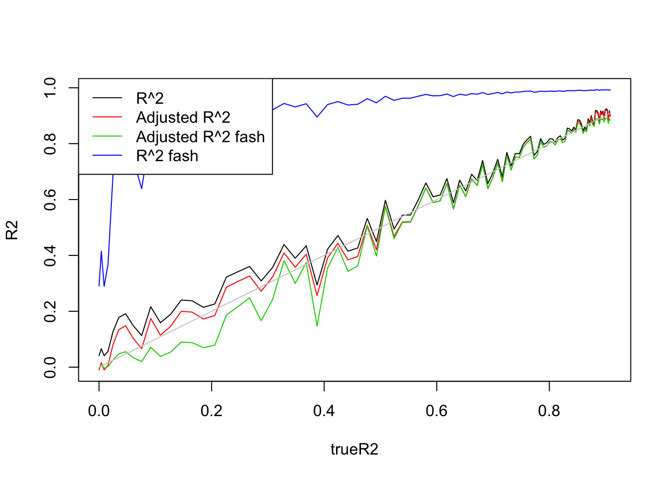 (note: this is the old idea which introduces bias to R^2 when multiplying \(\frac{n-p-1}{n-1}\) so I discard this method.)(Shrunk R^2 = \(1 - \exp(fash.output)*\frac{n-p-1}{n-1}\), because \(R^2=1-\frac{\sum(y_i-\hat y_i)^2}{\sum(y_i-\bar y)^2}=1-\frac{\sum(y_i-\hat y_i)^2/(n-p-1)}{\sum(y_i-\bar y)^2/(n-1)}*\frac{n-p-1}{n-1}=1-(1-adjR^2)*\frac{n-p-1}{n-1}\))