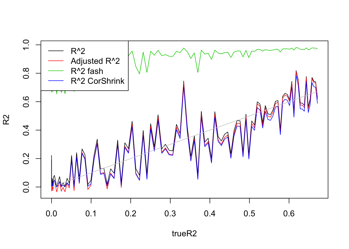 Shrunk R^2: use fash shrinking \(fash.output=\log(\frac{\sum(y_i-\hat y_i)^2/(n-1)}{\sum(y_i-\bar y)^2/(n-1)})\) then shrunk adjusted R^2 is \(1-\exp(fash.output)\)